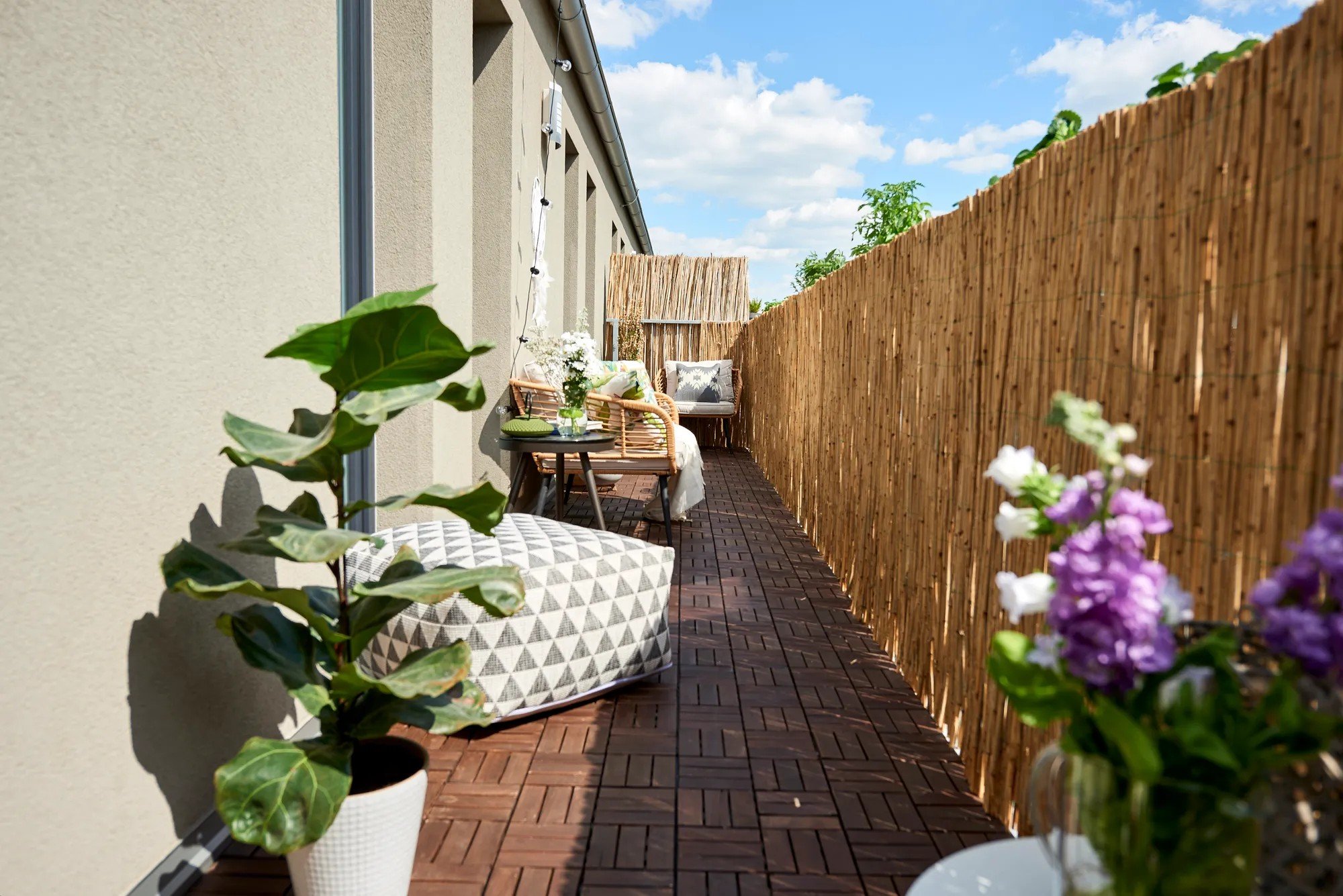 Na dlouhém úzkém balkoně funguje nábytek podél stěny – zůstane tak volný průchod a prostor bude působit větší.