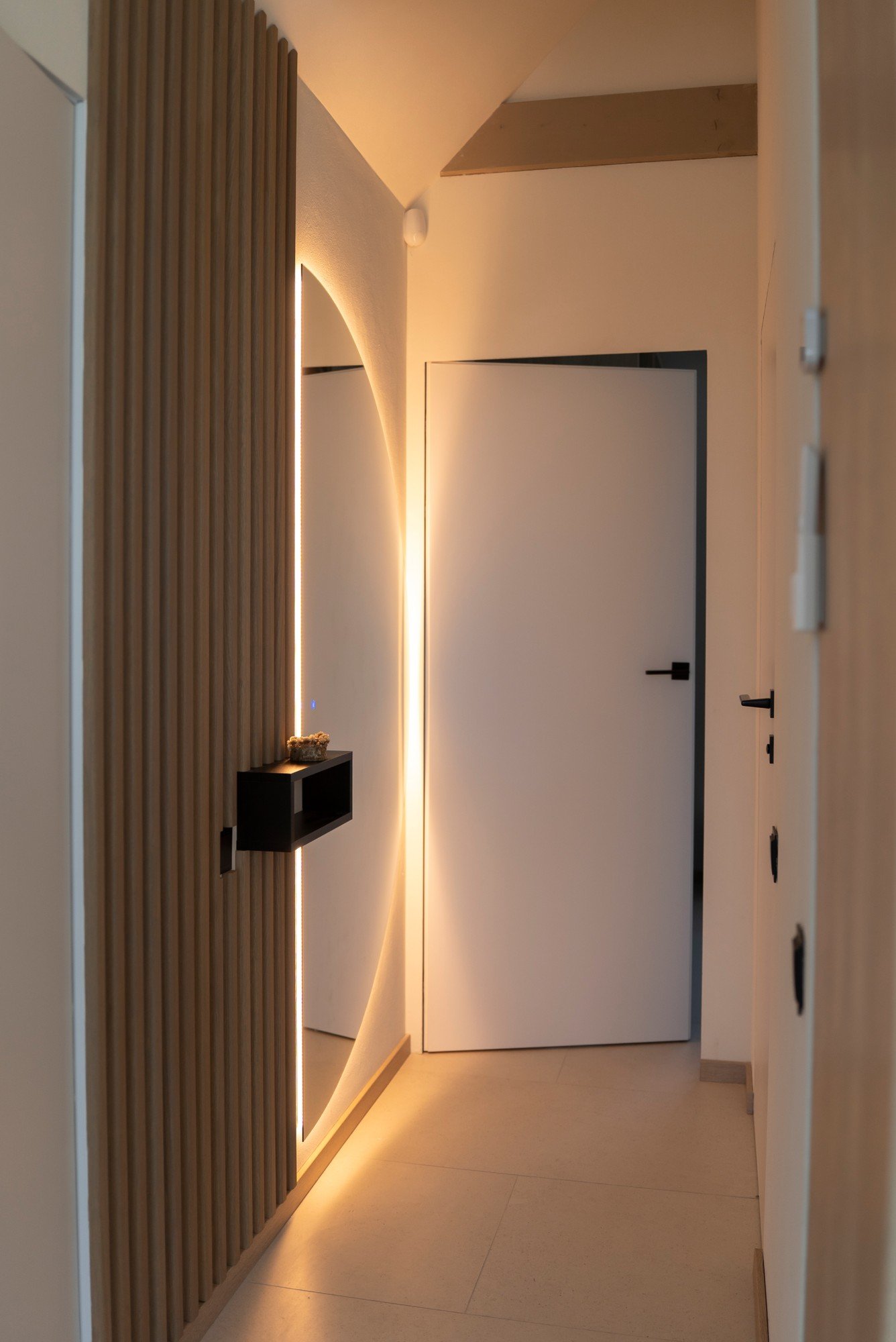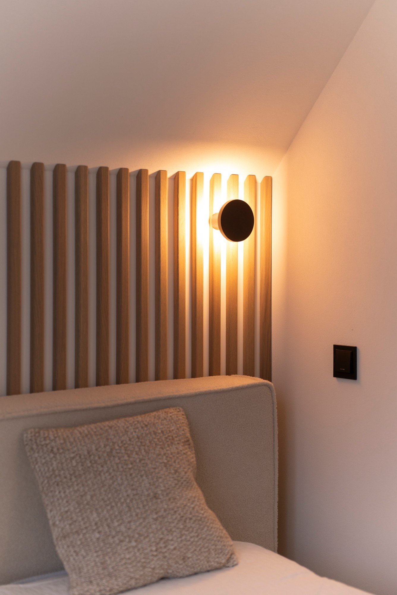 Spavaća soba dizajnirana je kao privatni prostor za opuštanje, gdje prevladavaju prirodni materijali i vizualna tišina. Namještaj od svijetlog drva stvara besprijekornu, estetski čistu kompoziciju, a vertikalni drveni zid iza kreveta postaje suptilan naglasak u japanskom stilu.