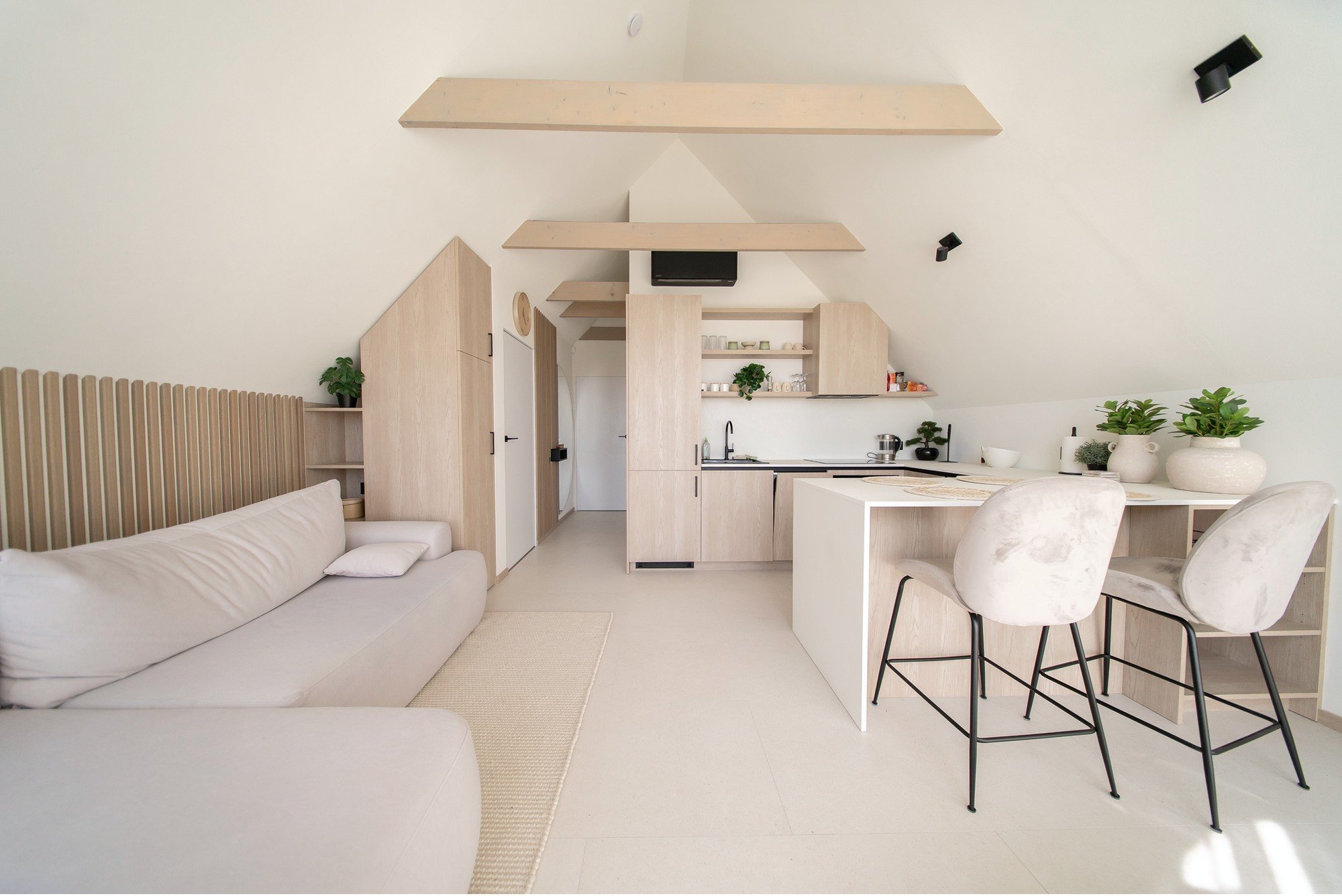 Vikendica u Palangi, samo nekoliko koraka od Baltičkog mora, dizajnirana je prema načelu "manje je više". Svaka odluka ovdje je usmjerena na kvalitetan odmor, estetski mir i promišljenu udobnost. To je prostor u kojem se moderna funkcionalnost spaja s prirodnom mirnoćom mora, a nježni minimalizam u japandi stilu pojačava osjećaj bliskosti s prirodom.
