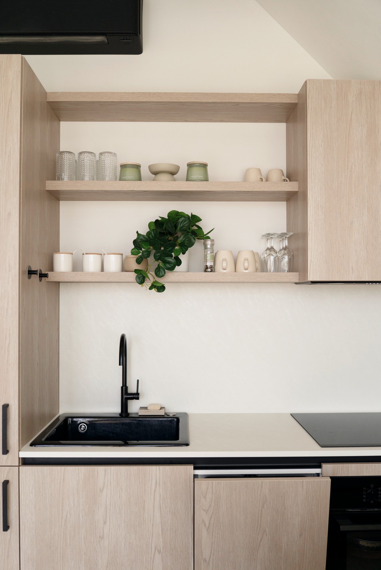 Okrugli namještaj svijetlih tonova omekšava arhitektonske linije i poziva vas na opuštanje. Minimalistička kuhinja sa svijetlim hrastovim teksturiranim fasadama i bijelom radnom pločom održava čistoću i estetski mir, dok crni detalji dodaju suptilan moderni naglasak.