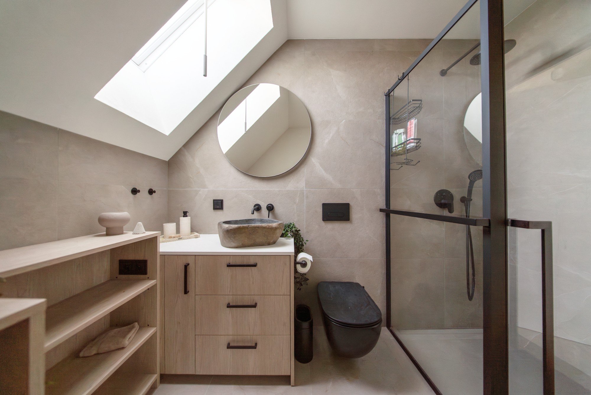 Umivaonik od prirodnog kamena postavljen na radnu ploču postaje prepoznatljiv dizajnerski akcent, naglašavajući povezanost s prirodom. Krovni prozor osigurava obilan protok prirodnog svjetla, vizualno proširujući prostor i stvarajući svijetao, skladan interijer kupaonice.