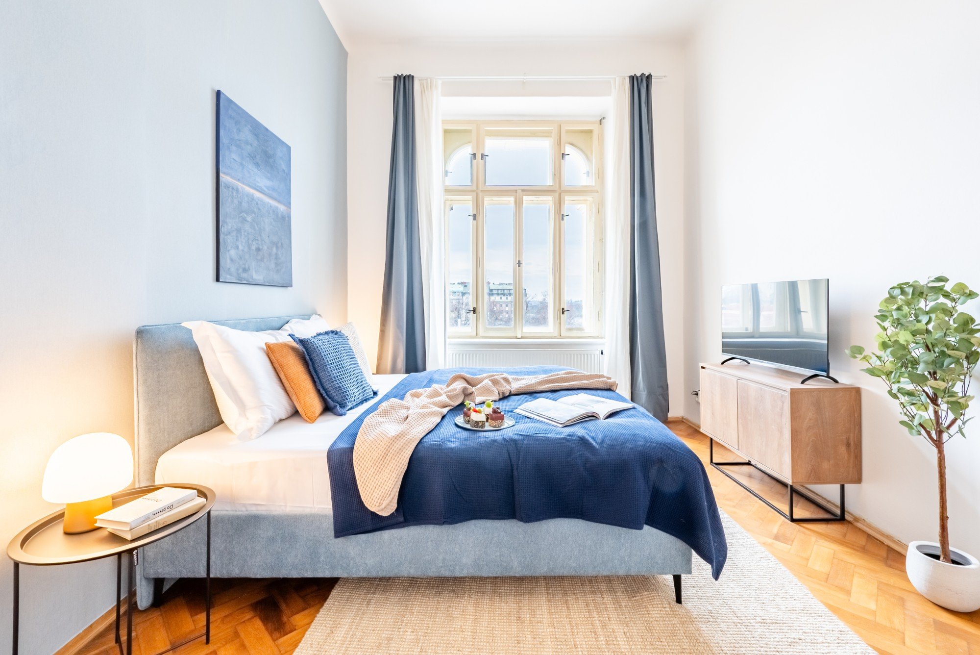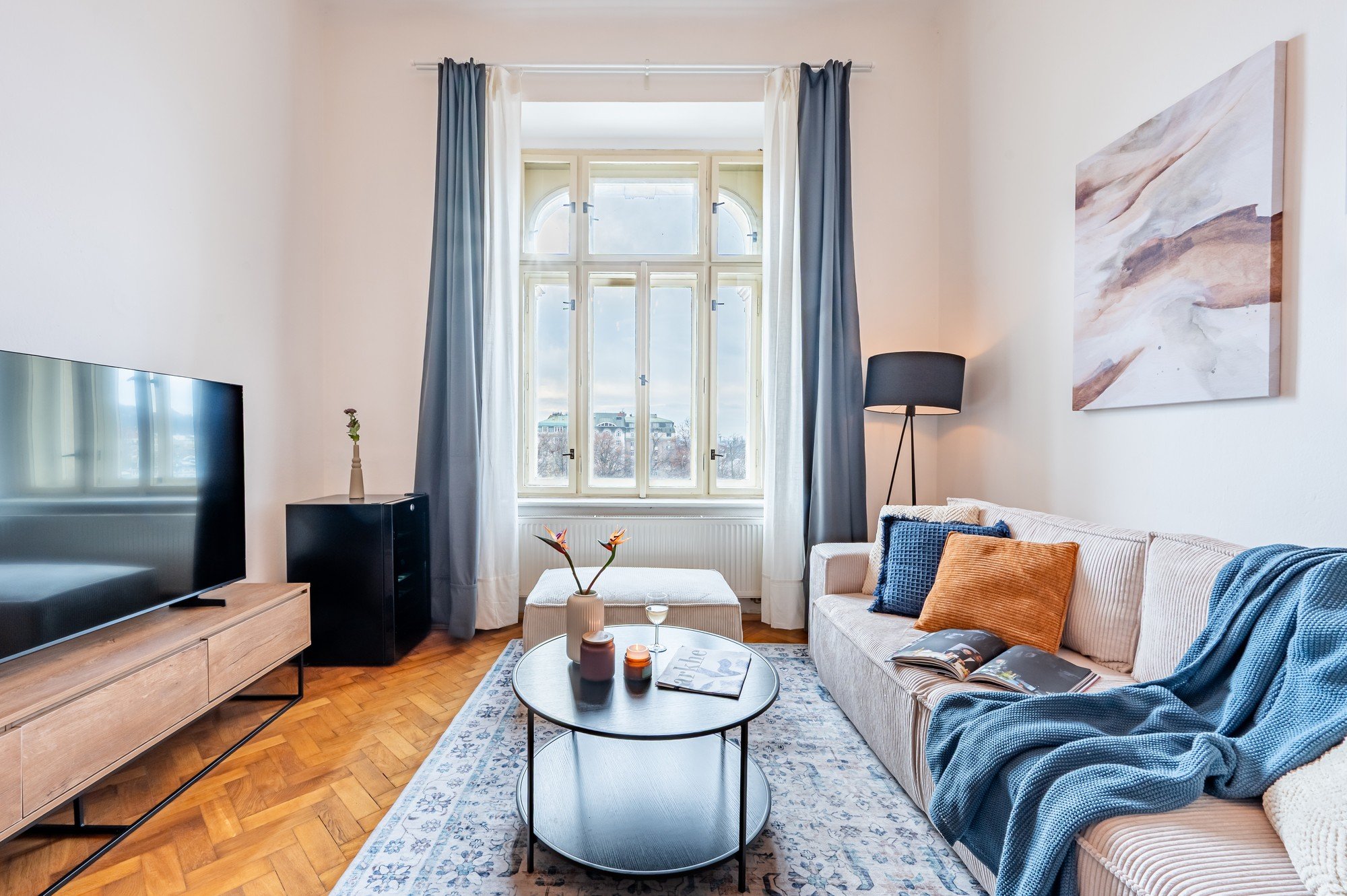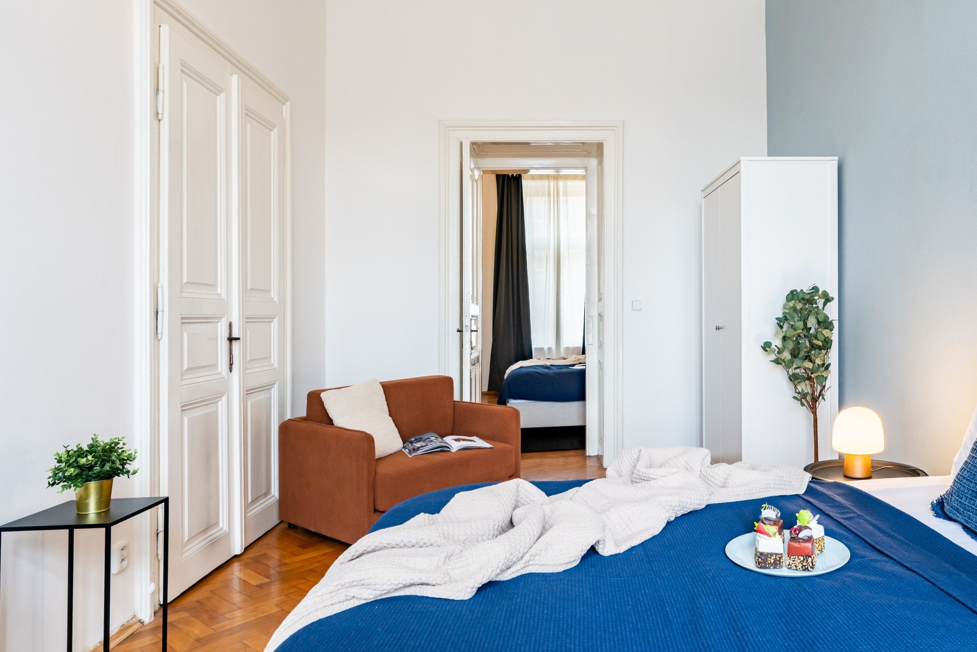 Vzdušný byt v historickém domě spojuje velkorysé proporce s promyšlenými detaily. Vysoké stropy, původní parkety a kontrast tmavého dřeva s jemnými odstíny modré vytvářejí nadčasový interiér, který je klidný, elegantní a přirozeně útulný. Dispozice navržená pro každodenní život i společné chvíle dokazuje, že komfort a charakter mohou jít ruku v ruce.