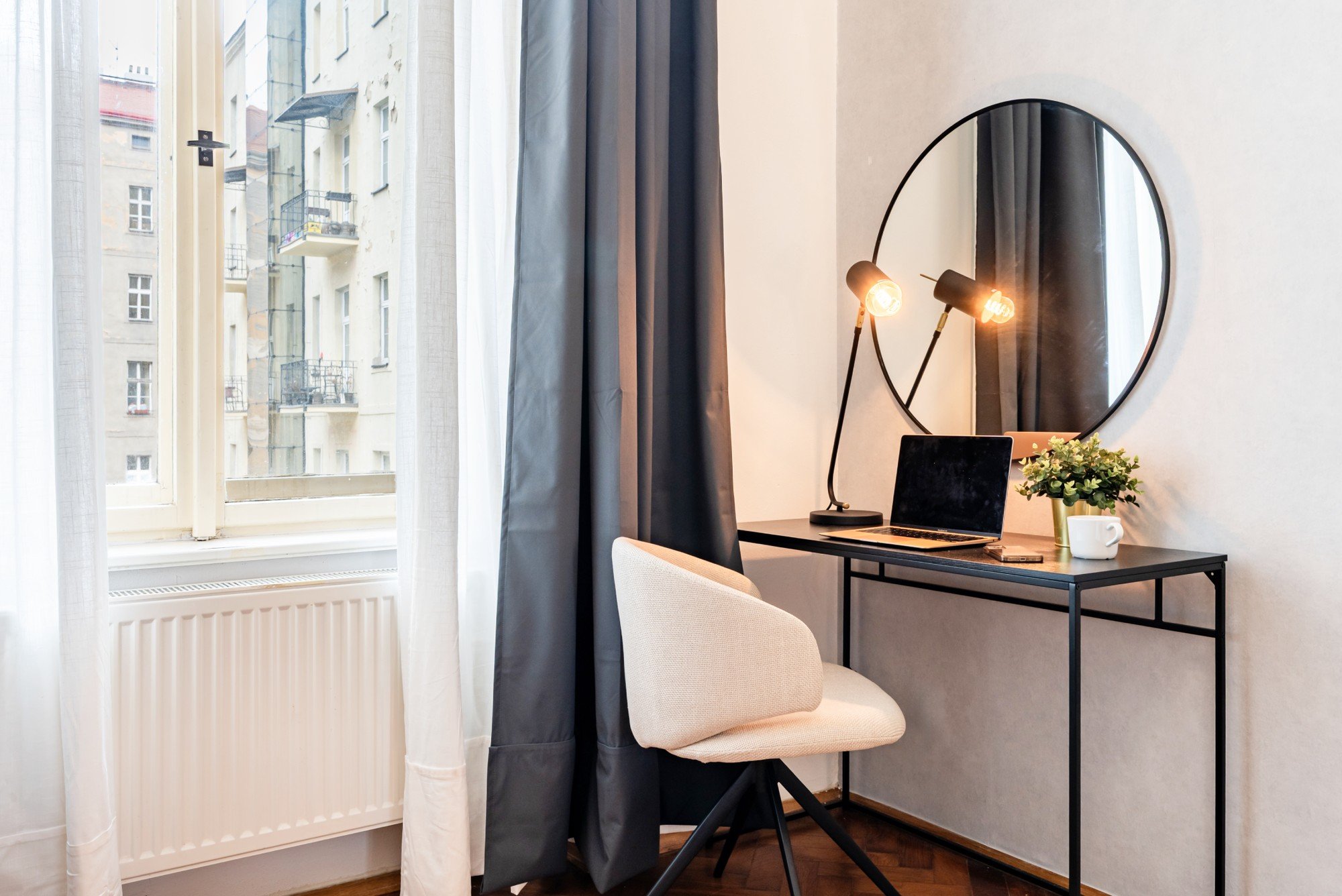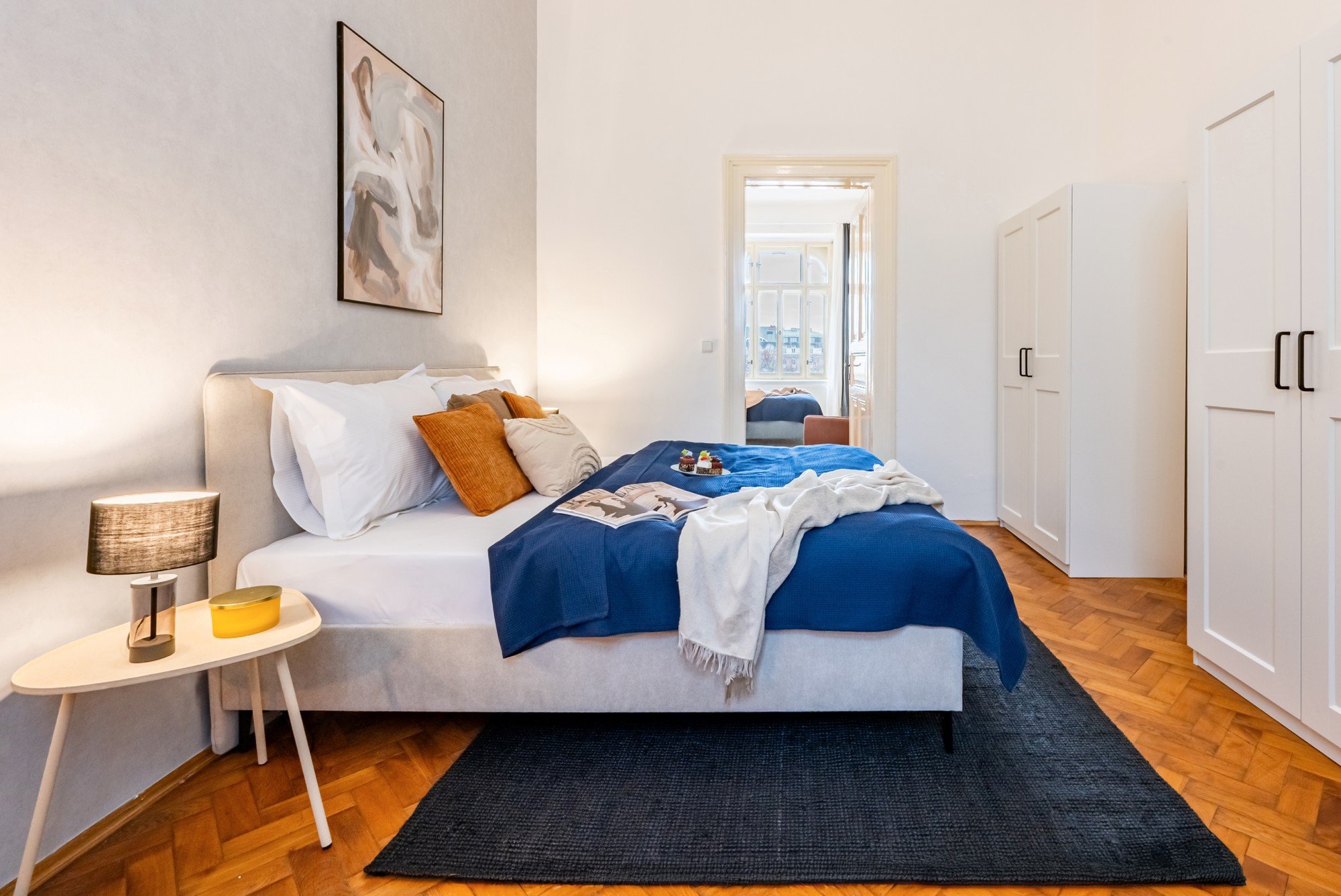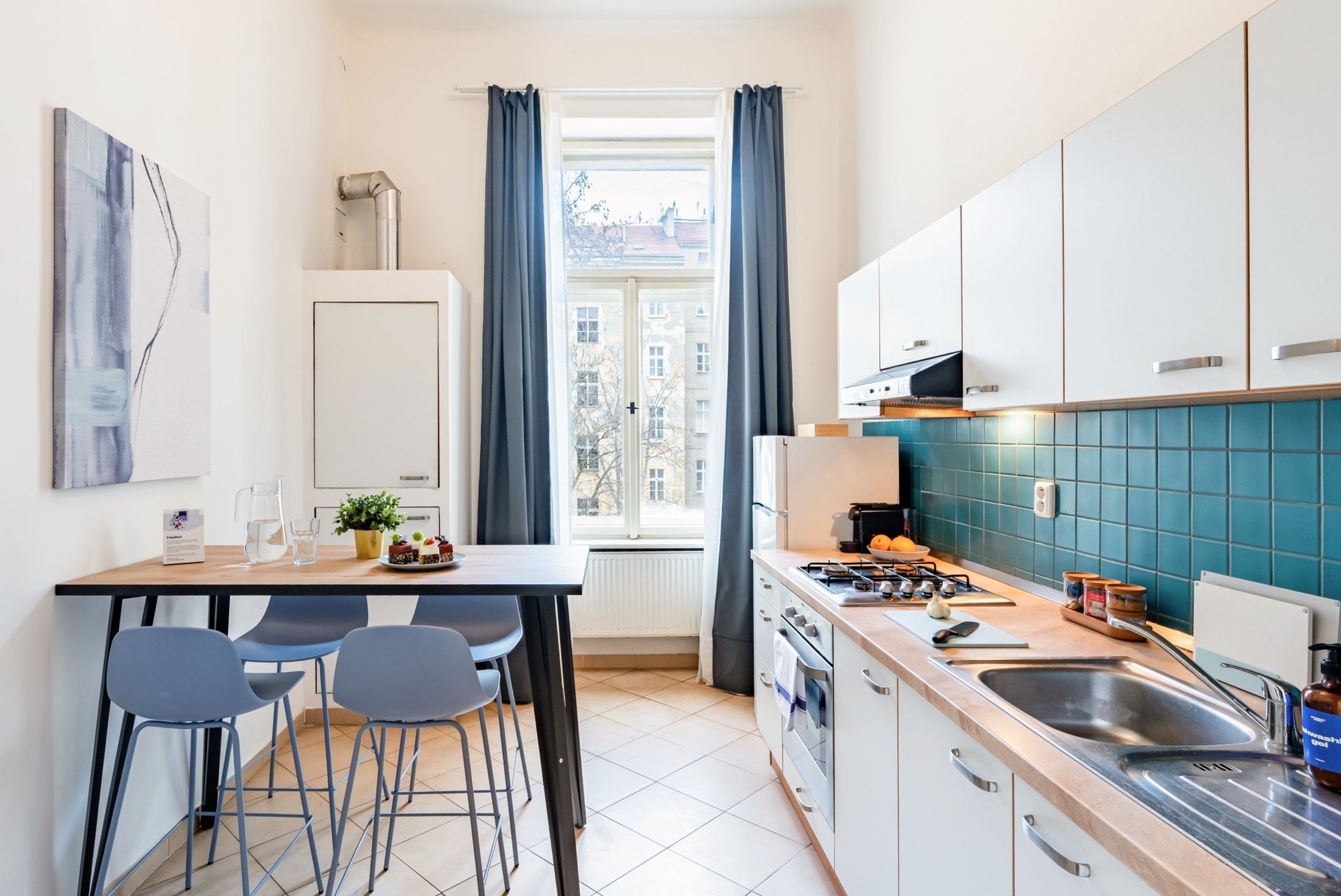 Vzdušný byt v historickém domě spojuje velkorysé proporce s promyšlenými detaily. Vysoké stropy, původní parkety a kontrast tmavého dřeva s jemnými odstíny modré vytvářejí nadčasový interiér, který je klidný, elegantní a přirozeně útulný. Dispozice navržená pro každodenní život i společné chvíle dokazuje, že komfort a charakter mohou jít ruku v ruce.