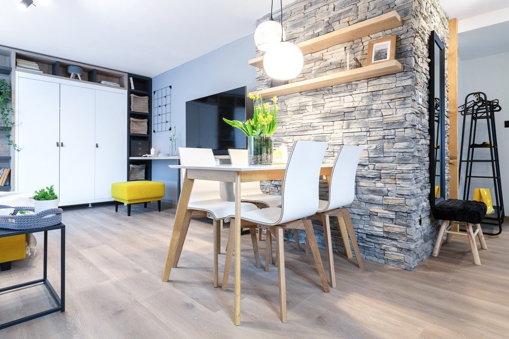 Postavljanjem sjedećih garnitura uz kameni zid ponovno su suptilno odvojili kuhinju od dnevnog boravka. I ovdje su preferirali jednostavnost. Za stolice i stol odlučili su se za elegantan oblik, klasični skandinavski dizajn i kombinaciju bijelog i svijetlog drva.