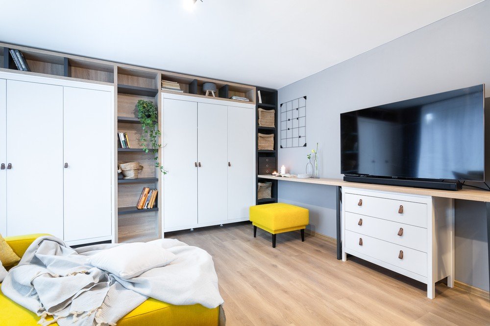 Kako interijer ne bi djelovao dosadno, osvježili su ga jarko žutom sofom koja se lako pretvara u udoban bračni krevet. Radi lakšeg rukovanja, dizajneri su se oslonili na komplet minimalističkih stolića za kavu u crnoj boji.