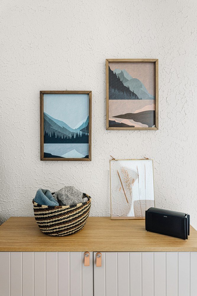 Rustikalna vaza, betonska svijeća i slike naslonjene na zid izgledaju ležerno.