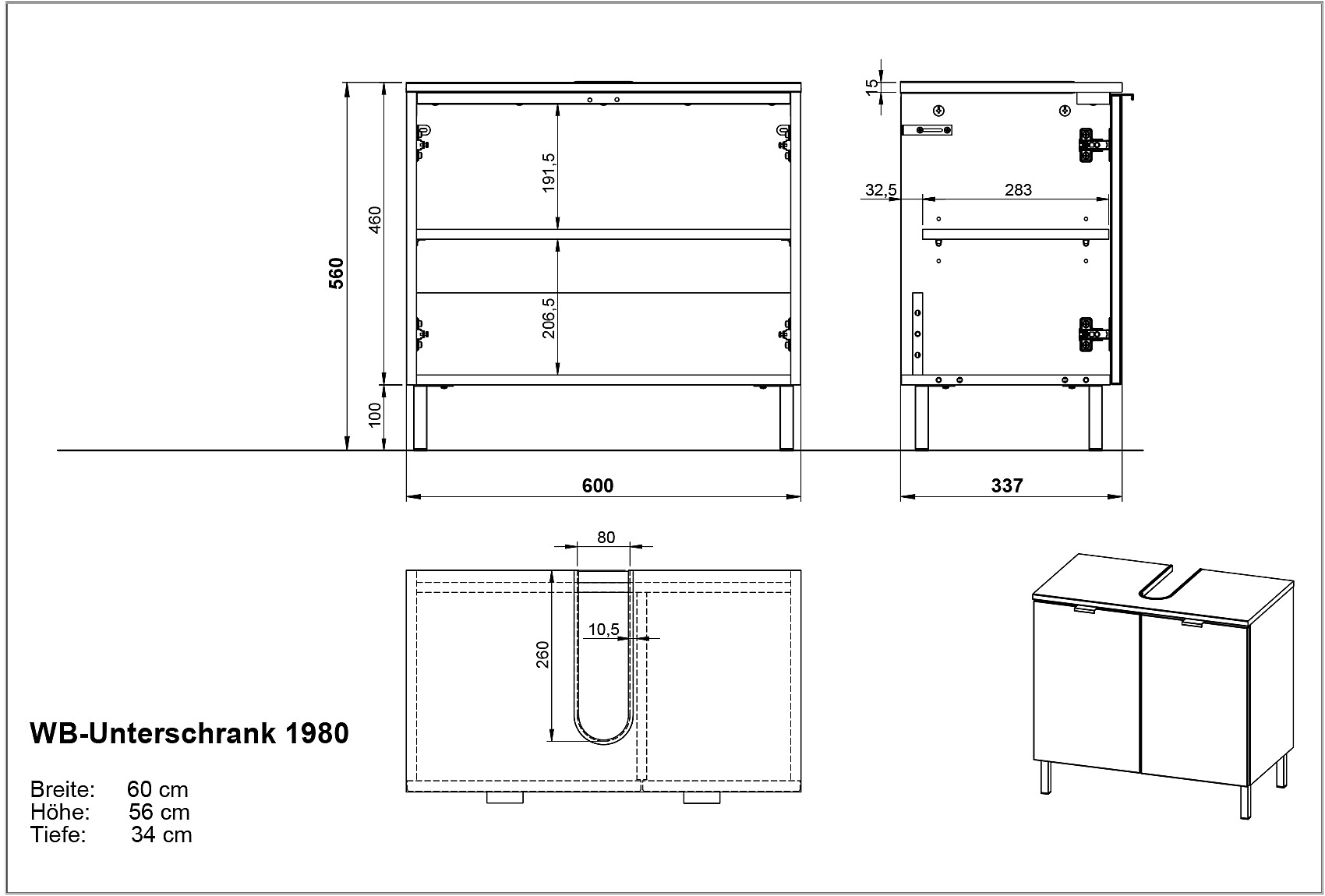 Ormarić za ispod umivaonika ArcenaOd iverice, završna obrada: Melamin, antracitno sivi, širina 60 cm, visina 56 cm, dubina 34 cm