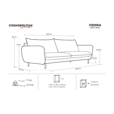 Prostrani i zaista udobni jastuci za sjedenje i mekani jastuci za naslon - to su glavne prednosti Vienna kauča. Omogućit će udobnost za do 4 člana obitelji ili veliki broj posjetitelja. Dizajn inspiriran pariškim šarmom i fokus na detalje oduševit će mnoge ljubitelje modernog namještaja. Zahvaljujući višim nogama ispod sofe, možete jednostavno usisati ili obrisati pod.