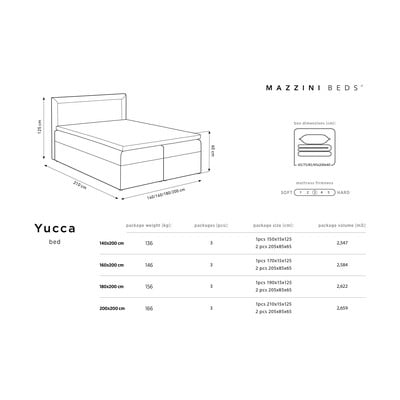 Priuštite si kvalitetan san, ali i dizajnersku dominaciju u svojoj spavaćoj sobi. Visoku eleganciju jamči baršunasta tkanina mekog sjaja, koja ne samo da oduševljava oko, već vas očarava svojom mekoćom i dobrom otpornošću na habanje. Međutim, zbog visoke kose može se neznatno promijeniti tijekom korištenja. Yucca kolekcija također se može pohvaliti genijalnim prostorom za pohranu i srednje tvrdim madracem koji sadrži 838 džepnih opruga. A da baš ne želite ustati, cijeli krevet je gotov slojem od 7 cm. Zbog različitih vrsta monitora i njihove kalibracije, boja kreveta može se zapravo razlikovati. Priuštite si kvalitetan san, ali i dizajnersku dominaciju u svojoj spavaćoj sobi. Visoku eleganciju jamči baršunasta tkanina mekog sjaja, koja ne samo da oduševljava oko, već vas očarava svojom mekoćom i dobrom otpornošću na habanje. Međutim, zbog visoke kose može se neznatno promijeniti tijekom korištenja. Yucca kolekcija također se može pohvaliti genijalnim prostorom za pohranu i srednje tvrdim madracem koji sadrži 838 džepnih opruga. A da baš ne želite ustati, cijeli krevet je gotov slojem od 7 cm. Zbog različitih vrsta monitora i njihove kalibracije, boja kreveta može se zapravo razlikovati. Set uključuje: srednje čvrsti opružni madrac (3/5) sa 838 opruga, prostori za odlaganje koji se otvaraju sa strane i gornji madrac visine 7 cm.