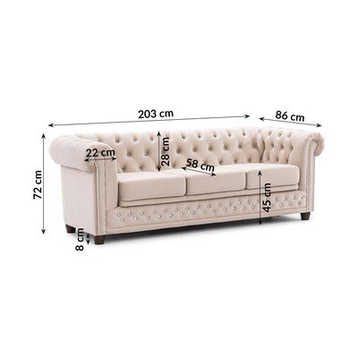 Baršunasti, sklopiva, chesterfield, bež, vodootporna/otporna na mrlje, s 2 mjesta, širina 203 cm