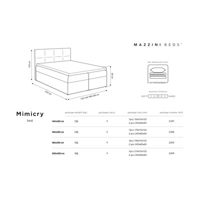 Idealna kombinacija visoke udobnosti i elegantnog dizajna. Baršunasta tkanina mekog sjaja ne samo da dobro izgleda, nego će vas i očarati svojom mekoćom i otpornošću na vanjske utjecaje. Međutim, zbog visoke kose može se lako promijeniti tijekom korištenja. Ostale prednosti kreveta su bogat prostor za odlaganje i srednje tvrdi madrac koji sadrži 838 džepnih opruga. Za maksimalnu udobnost, cijeli krevet je upotpunjen pokrovnim slojem od 7 cm. Zbog različitih vrsta monitora i njihove kalibracije, boja kreveta može se zapravo razlikovati. Set uključuje: srednje čvrsti opružni madrac (3/5) sa 838 opruga, prostori za odlaganje koji se otvaraju sa strane i gornji madrac visine 7 cm.