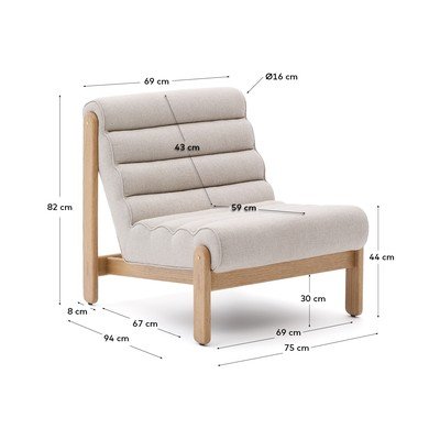 Fotelja Magira brenda Kave Home, koju je dizajnirao Morten Georgsen, rezultat je kombinacije udobnosti i sofisticiranog dizajna. Njena konstrukcija izrađena je od masivnog hrasta s brušenom završnom obradom i lakom na bazi vode. Dizajn naglašava detalje poput baze, koja je također izrađena od masivnog hrasta, nadopunjujući gornju konstrukciju vizualnom koherentnošću i funkcionalnošću. Naslon i sjedalo, s prepoznatljivim horizontalnim šavovima, ispunjeni su pjenom srednje gustoće (30 kg/m³), što osigurava ergonomsko i ugodno iskustvo sjedenja. Poliesterska tkanina s efektom vune daje fotelji vizualnu toplinu i ugodna je na dodir, upotpunjujući stolicu dizajniranu za maksimalnu udobnost.