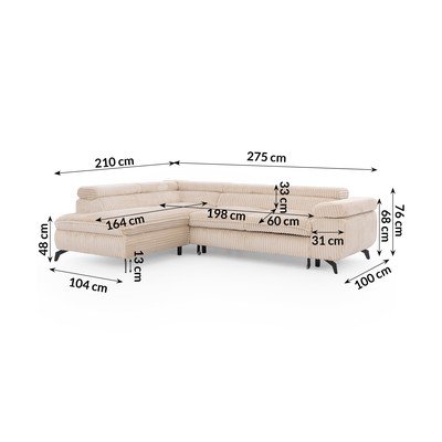 Od samtaPodesiva/sklopiva/s prostorom za odlaganjeS lijevim kutom/u obliku slova LBežPogodna za kućne ljubimce/otporna na mrljeS 4 mjestaŠirina 275 cm