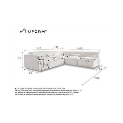 S desnim kutom/u obliku slova LBežOstaliŠirina 265 cmDubina 245 cmDubina sjedala 58 cm