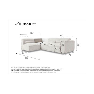 S lijevim kutom/u obliku slova LBežS 4 mjestaŠirina 265 cmDubina 169 cmDubina sjedala 58 cm