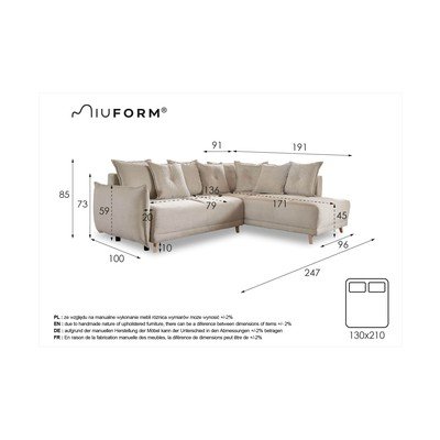Od samtaSklopiva/s prostorom za odlaganjeS desnim kutom/u obliku slova LBežS 3 mjestaŠirina 247 cmDubina 191 cmDubina sjedala 79 cm