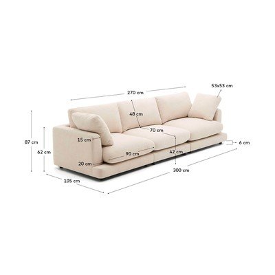 Gala sofa brenda Kave Home komad je namještaja koji u vašem dnevnom boravku kombinira dizajn, udobnost i kvalitetu. Njezini zaobljeni oblici i velikodušne dimenzije stvaraju ugodnu atmosferu, idealnu za uživanje u posebnim trenucima s obitelji ili prijateljima. Presvlaka od visokokvalitetne šenil tkanine fine strukture, izrađena od poliestera i pamuka, pruža meku i ugodnu teksturu na dodir, a istovremeno osigurava izvanrednu otpornost i izdržljivost. Tkanina je tretirana protiv mrlja, što omogućuje čišćenje vlažnom krpom. Uklonjive navlake sjedala i naslona mogu se prati u perilici rublja. Dobavljač tkanine ima certifikat OEKO-TEX® STANDARD 100, što jamči ekološki sigurnu i odgovornu proizvodnju. Punjenje sjedala izrađeno je od 100% mekih silikoniziranih vlakana, koja pružaju vrlo mekan osjećaj. Jezgra od pjene gustoće 30 kg/m³ omotana je vlaknima s obje strane, što omogućuje rotiranje sjedala. Navlake za jastuke su uklonjive i reverzibilne. Unutarnja struktura izrađena je od borovog drva certificiranog FSC Mix Credit, što znači da dolazi od mješavine materijala iz FSC certificiranih šuma i kontroliranog drva. Proizvedena u Europi, sofa Gala odražava kvalitetu i brigu u svakom detalju.