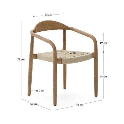 Blagovaonska stolica Nina brenda Kave Home izrađena je od prirodnih materijala i ručno izrađena. Njena konstrukcija s naslonima za ruke izrađena je od masivnog bagremovog drva s prirodnom završnom obradom, pri čemu svaki komad ima jedinstvene tonove i teksturu drveta. Drvo ima FSC™ certifikat, što jamči odgovorno gospodarenje šumama. Sjedalo stolice izrađeno je od ručno tkanog užeta otpornog na UV zračenje. Stolica se može slagati i pogodna je za unutarnju i vanjsku upotrebu.