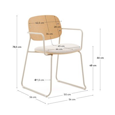 Blagovaonska stolica Meli brenda Kave Home kombinira prirodne materijale s metalnim okvirom. Naslon je izrađen od šperploče od topole, dok je sjedalo izrađeno od šperploče od topole presvučene ugodnim šenil materijalom. Struktura stolice, uključujući naslone za ruke i noge, izrađena je od mikroteksturiranog metala. Tkanina sjedala ima certifikat OEKO-TEX® STANDARD 100, koji jamči ekološki prihvatljivu i odgovornu proizvodnju. Drvo korišteno u stolici ima certifikat FSC Mix Credit, što znači da dolazi od mješavine materijala iz certificiranih šuma i kontroliranog drva. Kako bi se zaštitio pod, noge stolice opremljene su posebnim zaštitnicima.