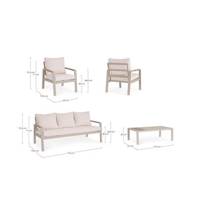 Vrtni set Elna brenda Bizzotto nudi cjelovito rješenje za sjedenje na otvorenom. Set uključuje sofu, dvije fotelje i stolić za kavu, koji zajedno pružaju prostor za pet osoba. Struktura cijelog seta izrađena je od aluminija, upotpunjena mekim punjenjem za udobnost. Sofa ima dimenzije 173 x 73,5 x 75,5 cm, s visinom sjedala od 40 cm i visinom naslona za ruke od 54,8 cm. Fotelje imaju dimenzije 64 x 73,5 x 75,5 cm, s istom visinom sjedala od 40 cm i visinom naslona za ruke od 54,8 cm. Stolić za kavu dimenzija 110 x 67 x 35 cm upotpunjuje ovaj set.
