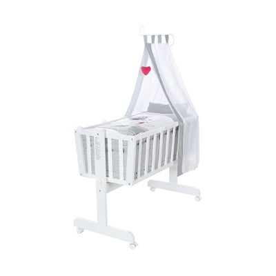 Set uključuje madrac, gnijezdo, baldahin s držačem i set kotača s kočnicama. Navlaka za madrac i jastuk (40 x 35 cm) i navlaka za poplun (80 x 80 cm) izrađeni su od 100% pamuka. Punilo dekice za bebe sastoji se od prozračnih klimatskih vlakana s regulacijom temperature.