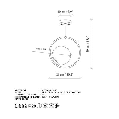 Sa staklenim sjenilom, metalna, bijela/mjedena, 39x26 cm, visina 15 cm