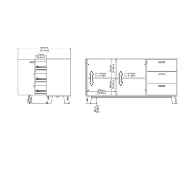Dva zatvorena ormarića s podesivim policama i tri ladice pružaju dovoljno prostora za pohranu. Moderan, minimalistički dizajn s blago zakošenim nogama savršeno se uklapa u suvremene interijere.