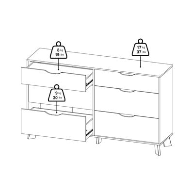 S dimenzijama 156x92x40 cm, nudi šest prostranih ladica na kugličnim ležajevima za jednostavno otvaranje. Bijele fronte ladica u kontrastu su s prirodnim hrastovim okvirom, stvarajući moderan i sofisticiran izgled. Praktični izrezi umjesto ručki daju komodi čist dizajn.