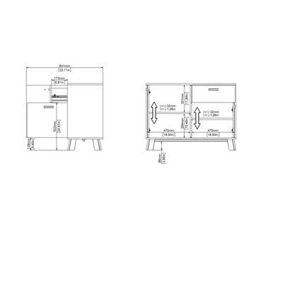 S dimenzijama od 99x73x39 cm nudi obilje prostora za pohranu u tri zatvorena odjeljka i jednoj ladici. Bijela vrata i ladice u kontrastu su s prirodnim hrastovim ukrasom okvira i kosim nogama, stvarajući moderan izgled. Drvene ručke savršeno se uklapaju u cjelokupni dizajn.
