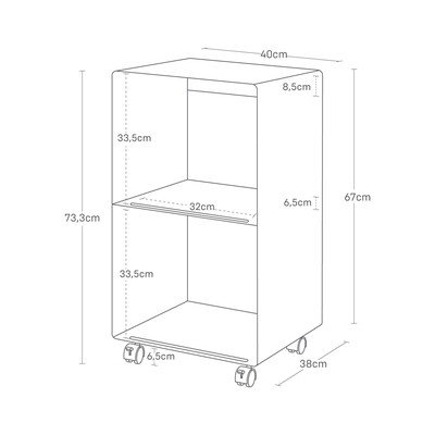Mobilna polica Tower brenda YAMAZAKI praktičan je dodatak svakoj prostoriji. Ova metalna polica dimenzija 40 x 38 x 73 cm (širina x dubina x visina) idealna je za uredno organiziranje LP ploča. Gornja površina police može podnijeti do 5 kg, dok unutarnje police imaju maksimalnu nosivost od 25 kg. Zahvaljujući kotačima, možete je lako premjestiti gdje vam je potrebna.