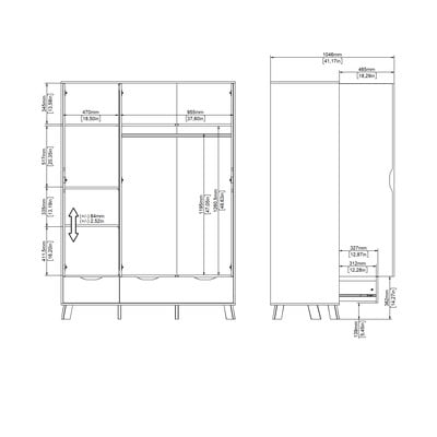 Ovaj prostrani ormar u završnici od bijelog hrasta ima troja vrata, od kojih su jedna opremljena ogledalom. Unutra ćete pronaći dvije podesive i dvije fiksne police te šipku za odjeću. U dnu ormarića nalaze se tri prostrane ladice. S dimenzijama od 147x201x58 cm, pruža dovoljno prostora za pohranu vaše odjeće i dodataka.