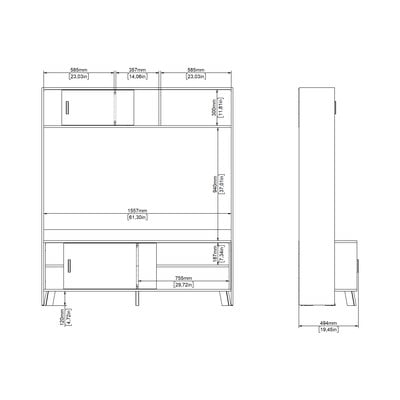 Ovaj ormarić dimenzija 159x181x48 cm u boji bijelog hrasta nudi mnogo prostora za pohranu vaše elektronike i dodataka. Gornji i donji dio imaju klizna vrata za lakši pristup, dok otvorene police pružaju prostor za ukrase ili često korištene predmete. Donji skladišni prostor s pregradom i dvije police idealan je za diskretno skladištenje.