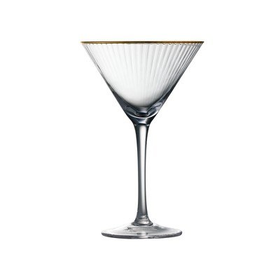 Set od četiri čaše za koktel Palermo marke Lyngby Glas. Njihov elegantni rebrasti dizajn sa zlatnim rubom daje im moderan vintage izgled, a svaki komad je jedinstven zbog svoje ručno izrađene prirode.