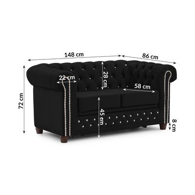 Baršunasti, sklopiva, chesterfield, crna, vodootporna/otporna na mrlje, s 2 mjesta, širina 148 cm