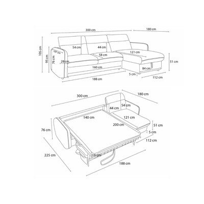 Za spavanje/podesiva/sklopiva/s prostorom za odlaganjeS desnim kutom/s lijevim kutom/promjenjiva/s ležaljkomVodootpornaCrnaS 4 mjestaŠirina 300 cmDubina 180 cmDubina sjedala 58 cm