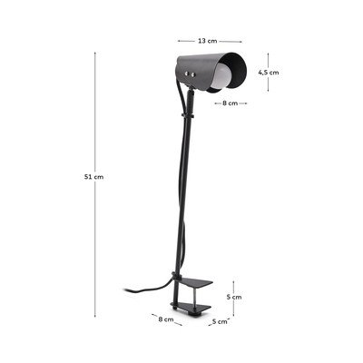 Stolna lampa Jula brenda Kave Home dizajnirana je za one koji traže prilagodljivu rasvjetu modernog stila. Njezin dizajn inspiriran je funkcionalnošću klasičnih reflektora i obogaćen suvremenom elegancijom. Zahvaljujući tankim i preciznim linijama, lampa će se skladno uklopiti u svaki prostor. Pruža diskretno, ali svestrano svjetlo koje možete lako orijentirati vodoravno ili okomito kako biste uvijek postigli idealan kut. Sjenilo s organskim oblicima daje lampi sofisticiran i jedinstven dodir, pretvarajući tipičnu lampu s kopčom u dizajnerski komad. Mehanizam stezanja omogućuje jednostavno postavljanje na različite površine, što je čini idealnim izborom za kutove za čitanje ili radna područja gdje je potrebno precizno i podesivo svjetlo. Svjetiljka je kompatibilna s E27 žaruljama maksimalne snage 3 W (žarulja nije uključena) i pruža učinkovito i toplo osvjetljenje koje je savršeno za stvaranje ugodne atmosfere.