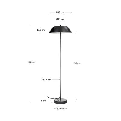 Podna lampa Sayra iz Kave Home unijet će minimalističku eleganciju u vaš interijer. Svjetiljka je visoka 153 cm i sastoji se od crnog metalnog sjenila koje je postavljeno na tanku šipku. Lampi stabilnost daje okruglo postolje izrađeno od crnog mramora, što svaki komad čini originalnim s jedinstvenim uzorkom i teksturom. Sayra lampa je kompatibilna sa žaruljama tipa E27 maksimalne snage 40 W. Žarulja nije uključena.
