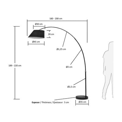 Crna podna svjetiljka s tekstilnim sjenilom spaja eleganciju i funkcionalnost. Njegov metalni stalak podesiv po visini od 189 do 220 cm i okretna ruka širine od 180 do 200 cm omogućuju fleksibilno osvjetljavanje prostora. Crna završna obrada metalne strukture i pamučnog sjenila stvara ujednačen, moderan izgled.