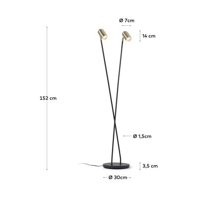 Podna lampa Clemence brenda Kave Home impresionira elegantnim kontrastom crne metalne konstrukcije i dva mesingana sjenila. Visoka je 152 cm i opremljena je s dva zglobna sjenila koja vam omogućuju usmjeravanje svjetla po potrebi. Svjetiljka je kompatibilna s E27 LED žaruljama maksimalne snage 3 W.
