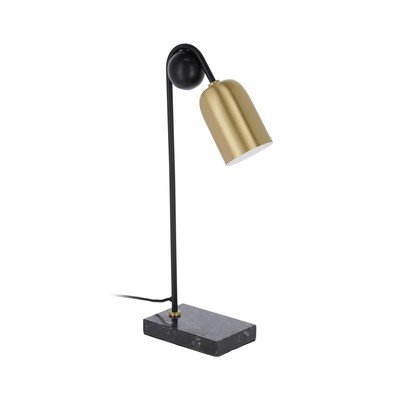 Ova stolna svjetiljka kombinira tri popularna materijala - mesingano sjenilo, mramornu bazu i puno drvo u slučaju ukrasne kugle.
