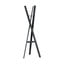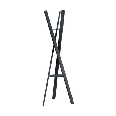 Stalak je izrađen od hrastovine u crnoj boji i upotpunjen metalnim elementima. Tri drvene letvice su domišljato povezane trokutastim metalnim elementima, stvarajući stabilnu i funkcionalnu cjelinu. Uključena je i okrugla ploča za odlaganje ključeva ili torbi.