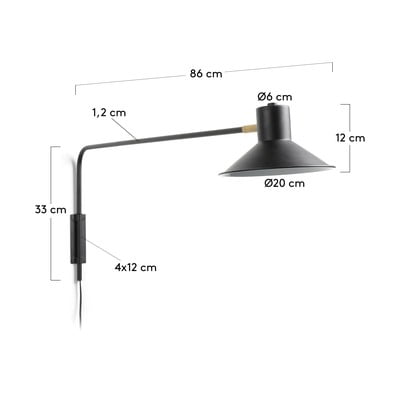 Zidna lampa Aria brenda Kave Home izrađena je od crnog obojenog čelika. Ima fleksibilni zglob koji olakšava usmjeravanje svjetla tamo gdje vam je potrebno. Svjetiljka je kompatibilna sa žaruljom tipa E14 maksimalne snage 25 W. Žarulja nije uključena u pakiranje.