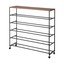 Stalak za cipele Tower brenda YAMAZAKI praktično je rješenje za organizaciju vašeg hodnika. Ovaj metalni stalak s pet krakova opremljen je kotačima s graničnicima, što olakšava pomicanje i istovremeno osigurava stabilnost kada je na mjestu. Na vrhu se nalazi polica za odlaganje izrađena od prirodnog furnira, koja se može koristiti za pohranu sitnih predmeta. Stalak može primiti do 20 pari cipela, ovisno o njihovoj veličini i obliku. Za dodatnu funkcionalnost, sa strane se nalaze dvije kuke, idealne za vješanje žlice za cipele ili kišobrana. Nosivost gornje police je 2 kg, svaki sloj može primiti 3 kg, a kuke imaju nosivost od 500 g.
