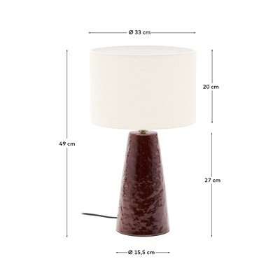 Stolna lampa Drava brenda Kave Home impresionirat će svojom konusnom glaziranom keramičkom bazom s teksturiranim efektom. Cilindrični pamučni sjenilo nježno filtrira svjetlost, pomažući u stvaranju ugodne i uravnotežene atmosfere u svakoj prostoriji. Svjetiljka je kompatibilna s E27 žaruljama maksimalne snage 40 W. Ovo je svestran komad koji će dodati dašak profinjenosti i funkcionalnosti i dnevnim boravcima i spavaćim sobama.