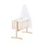 Kolijevka je opremljena robusnim, visokokvalitetnim ravnim šipkama i funkcijom ljuljanja s gumbom za zaključavanje. Pomoću mehanizma za zaključavanje, ljuljačka kolijevka može se pretvoriti u krevet. Tekstil kolijevke izrađen je od 100% pamuka bez štetnih tvari i nudi optimalnu klimu za spavanje. Set posteljine sastoji se od jastučnice (40 x 35 cm) i navlake za poplun (80 x 80 cm). Dječja poplun izrađen je od prozračnih i temperaturno regulirajućih klimatskih vlakana.