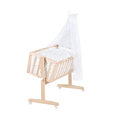 Roba kolijevka Adam i Owl idealna je za bebe od rođenja do otprilike 6 mjeseci. Kompletan set uključuje kolijevku, set kolijevke s prošivenom podlogom, madrac s površinom za spavanje 90 x 40 cm, branik, baldahin s šipkom i set kotačića s kočnicama. Kolijevka je opremljena robusnim, visokokvalitetnim ravnim šipkama i funkcijom ljuljanja s gumbom za zaključavanje. Pomoću mehanizma za zaključavanje, ljuljačka kolijevka može se pretvoriti u krevet. Tekstil kolijevke izrađen je od 100% pamuka bez štetnih tvari i nudi optimalnu klimu za spavanje. Set posteljine sastoji se od jastučnice (40 x 35 cm) i navlake za poplun (80 x 80 cm). Dječja poplun izrađen je od prozračnih i temperaturno regulirajućih klimatskih vlakana.
