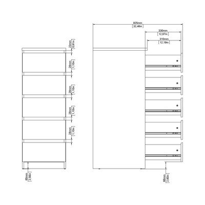 S uskim dimenzijama od 40x111x50 cm pogodan je i za manje prostore. Šest ladica na glatkim čeličnim klizačima pružaju dovoljno prostora za vaše stvari. Čist dizajn bez ručki daje komodi moderan izgled i naglašava njezinu jednostavnost.