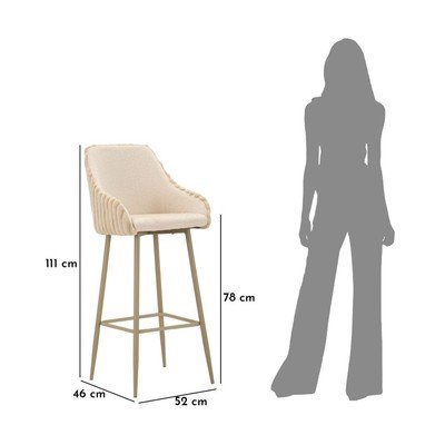 Barske stolice Alaska brenda Mauro Ferretti dolaze u setu od dvije i opremljene su naslonima za ruke za dodatnu udobnost. Sjedalo je visoko 78 cm. Dizajn stolica impresionira presvlakom s prepoznatljivim rebrastim uzorkom na vanjskoj strani naslona i naslona za ruke, što dodaje teksturu i stil. Za udobnu potporu nogama, svaka stolica opremljena je praktičnim naslonom visine 29 cm. Stabilna metalna konstrukcija nogu upotpunjuje cjelokupni izgled.