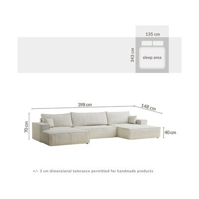 Od šenilaSklopiva/s prostorom za odlaganjeU obliku slova "U"KremOstaliŠirina 398 cmDubina 148 cmDubina sjedala 65 cm