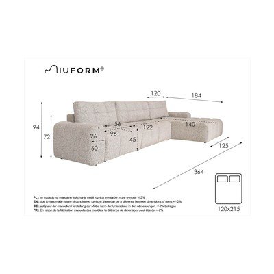 Sklopiva/s prostorom za odlaganjeS desnim kutomKremOstaliŠirina 364 cmDubina 184 cmDubina sjedala 56 cm